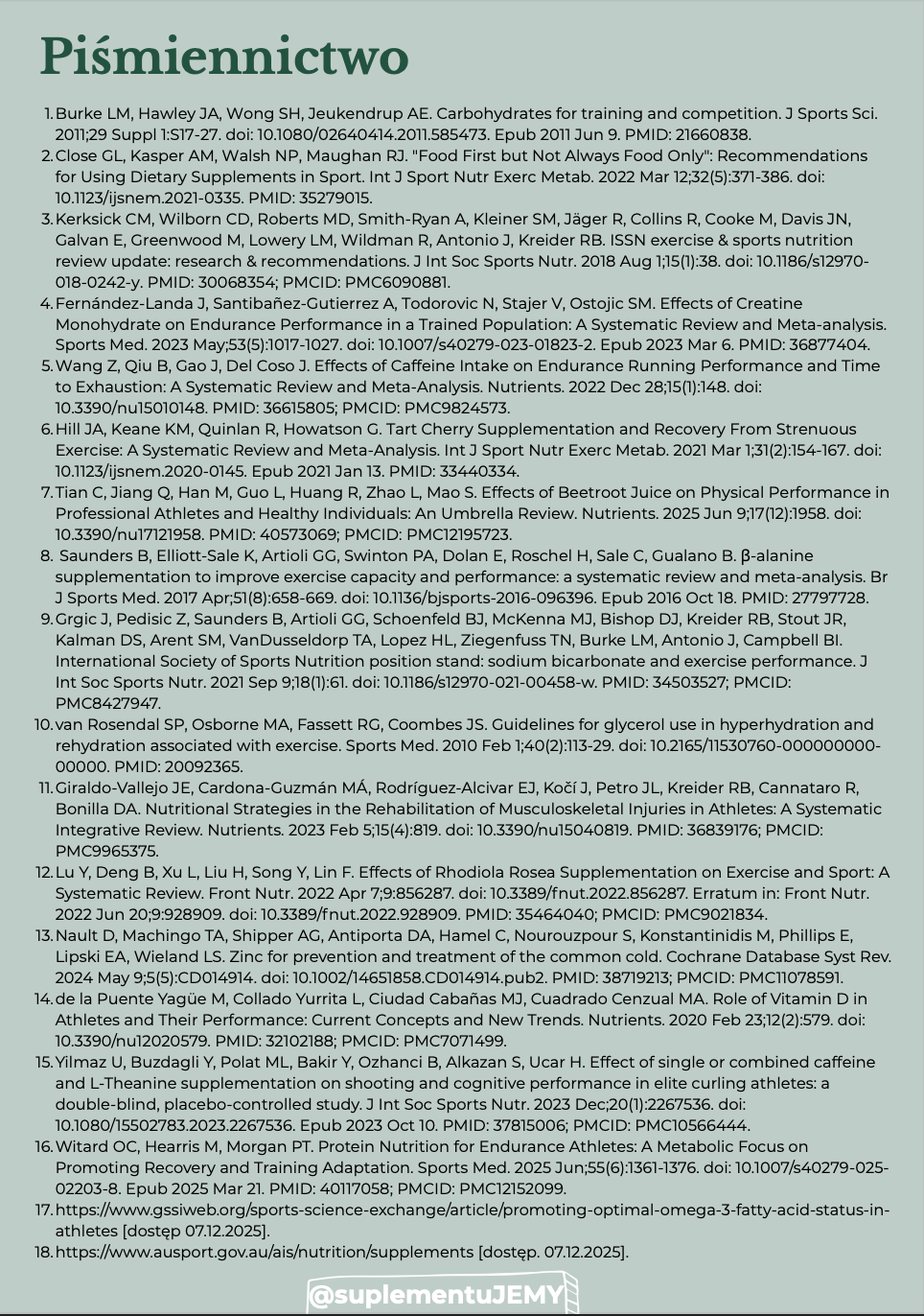 Przewodnik po suplementacji biegaczy powstał w jednym celu – by zebrać w jednym miejscu wszystkie potrzebne dla Ciebie informacje, które umożliwią Ci włączenie suplementacji zgodnie ze sztuką (czyli literaturą naukową). Z poradnika dowiesz się jak suplementować następujące związki: